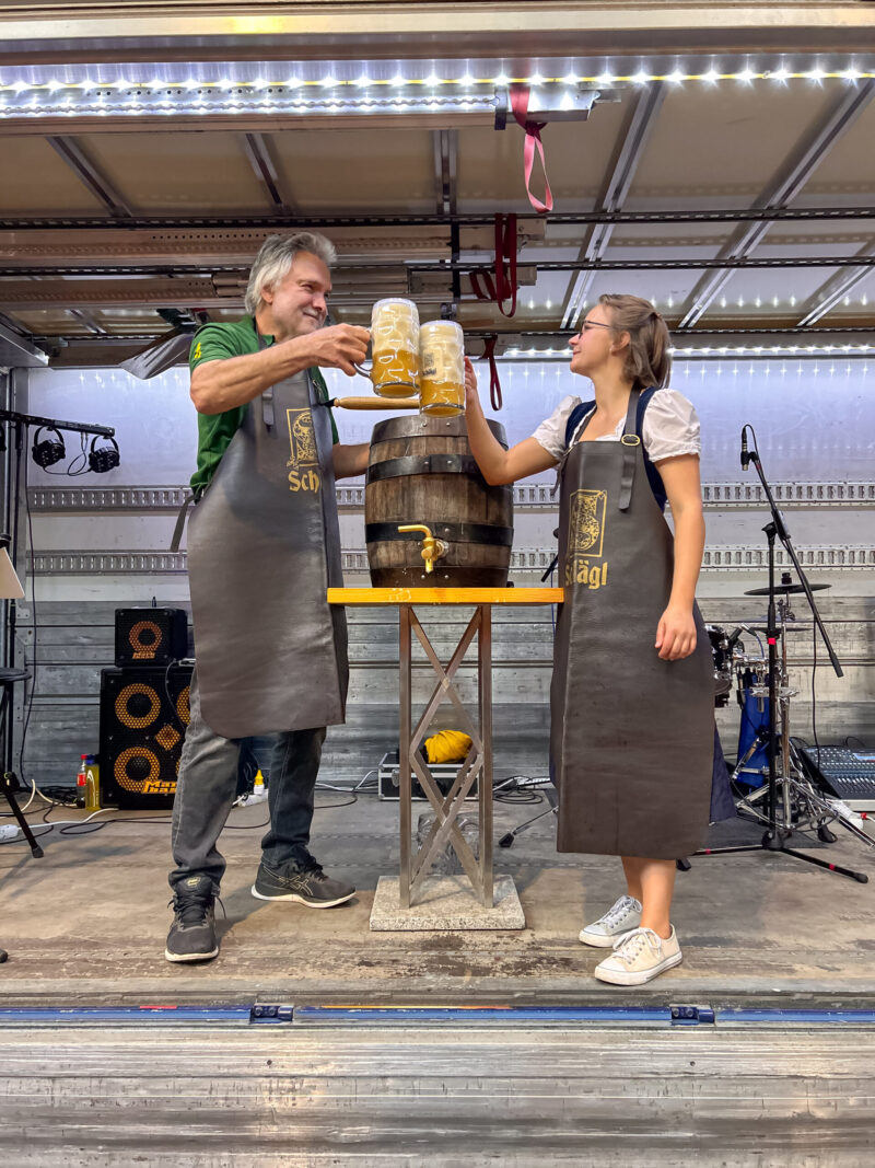 Höhepunkt des Abends war der Fassanstich von Fass Nummer 6. Unser treuer Schlägl-Wirt Mascher Willi griff zum Schlägel, sein Sohn Willi jun. stand ihm zur Seite – und mit einem kräftigen Schlag war das Fass perfekt angestochen.